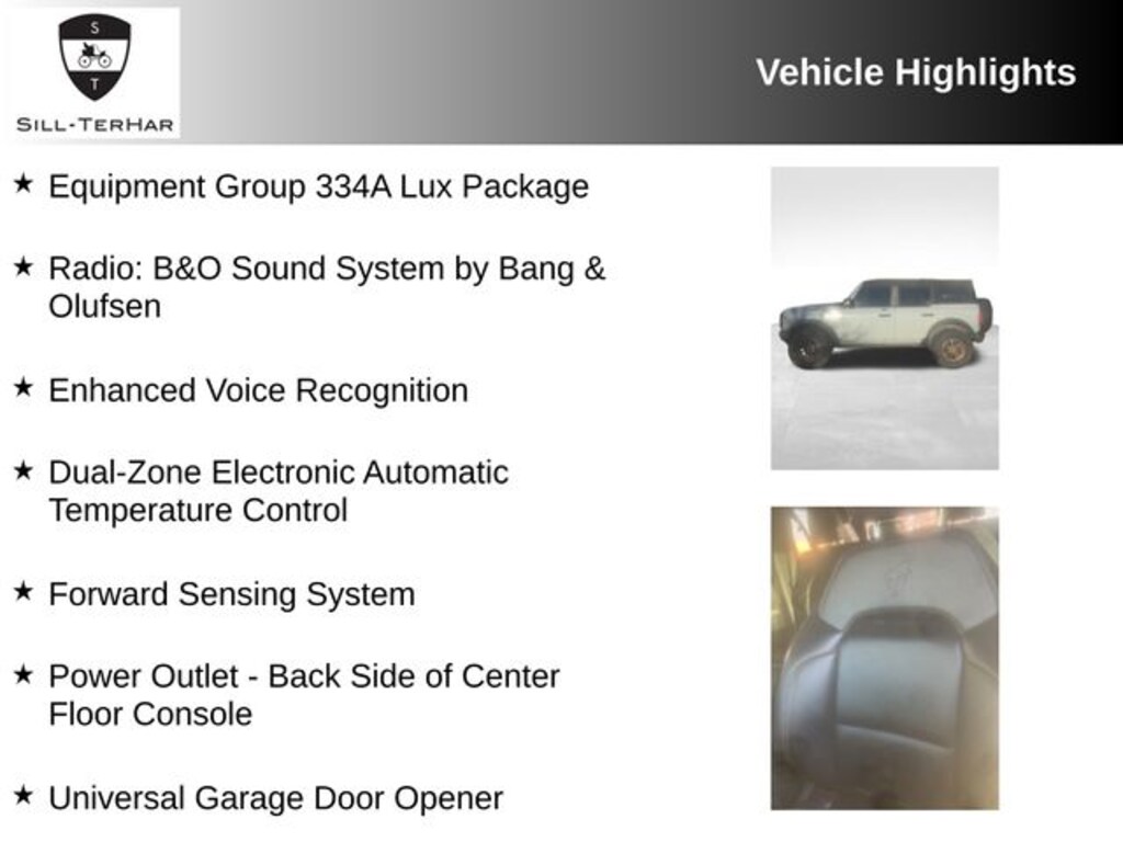 This 2021 Ford Bronco is rare!, 12" LCD Capacitive Touchscreen w/Swipe Capability, 2 Smart Charging USB Ports In Dashboard, 2-Door Intelligent Access w/Lock/Unlock, 360-Degree Camera, Adaptive Cruise Control, Additional Sound Deadening, Ambient Footwell Lighting, Auto-Dimming Interior Rear-View Mirror, Connected Built-In Navigation, Dr & Pass Illuminated Sliding Visor Vanity Mirrors, Dual-Zone Electronic Automatic Temperature Control, Enhanced Voice Recognition, Equipment Group 334A Lux Package, Evasive Steering Assist, Forward Sensing System, Front Row Heated Seats, Heated Steering Wheel, Information on Demand Panel, Power Outlet - Back Side of Center Floor Console, Radio: B&O Sound System by Bang & Olufsen, Reverse Sensing System, Sideview Mirrors, Universal Garage Door Opener, Wireless Charging Pad.