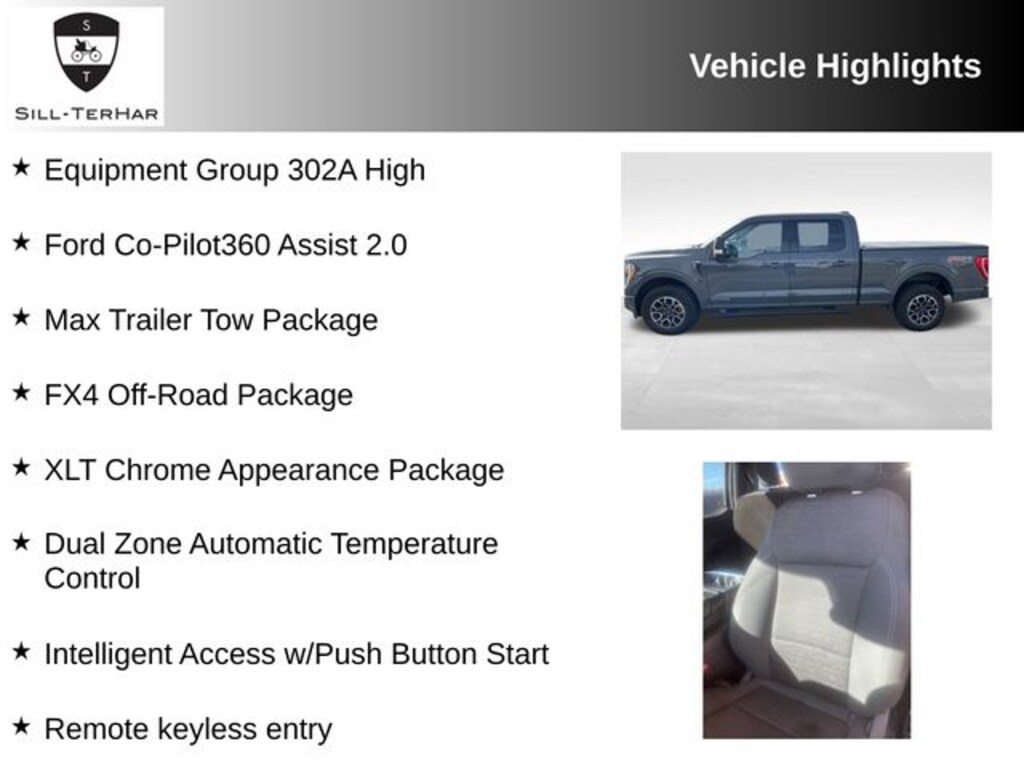 10-Way Power Driver & Passenger Seats, 4x4 FX4 Off-Road Bodyside Decal, 8" Productivity Screen in Instrument Cluster, ABS brakes, Alloy wheels, Class IV Trailer Hitch Receiver, Compass, Connected Built-In Navigation, Dual Zone Automatic Temperature Control, Electronic Stability Control, Equipment Group 302A High, Evasive Steering Assist, Extended Range 36 Gallon Fuel Tank, Ford Co-Pilot360 Assist 2.0, FX4 Off-Road Package, Heated door mirrors, Heated Front Seats, Hill Descent Control, Illuminated entry, Integrated Trailer Brake Controller, Intelligent Access w/Push Button Start, Intelligent Adaptive Cruise Control w/Stop & Go, Intersection Assist, Leather-Wrapped Steering Wheel, LED Box Lighting w/Zone Lighting, LED Reflector Headlamps, LED Sideview Mirror Spotlights, Low tire pressure warning, Max Trailer Tow Package, Monotube Rear Shocks, Off-Road Tuned Front Shock Absorbers, Onboard 400W Outlet, Power Glass Heated Sideview Mirrors, Pro Power Onboard - 7.2KW, Pro Trailer Backup Assist, Rear Under-Seat Storage, Remote keyless entry, Remote Start System w/Remote Tailgate Release, Rock Crawl Mode, SYNC 4 w/Enhanced Voice Recognition, Traction control, Tray Style Floor Liner, Twin Panel Moonroof, XLT Chrome Appearance Package.